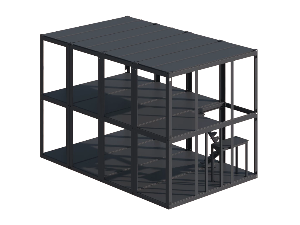 Здесь на вертикальные опорные стойки крепятся межэтажные и чердачные перекрытия. Для усиления конструкции модульного дома используются раскосины. Стеновой «пирог» также включают контробрешетку, гидроизоляцию, плиты утеплителя.
